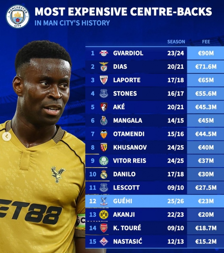 1月20日讯 曼城已经官宣签下格伊,《转会市场》也统计了曼城队史中卫引援榜,格伊仅位列第12位。